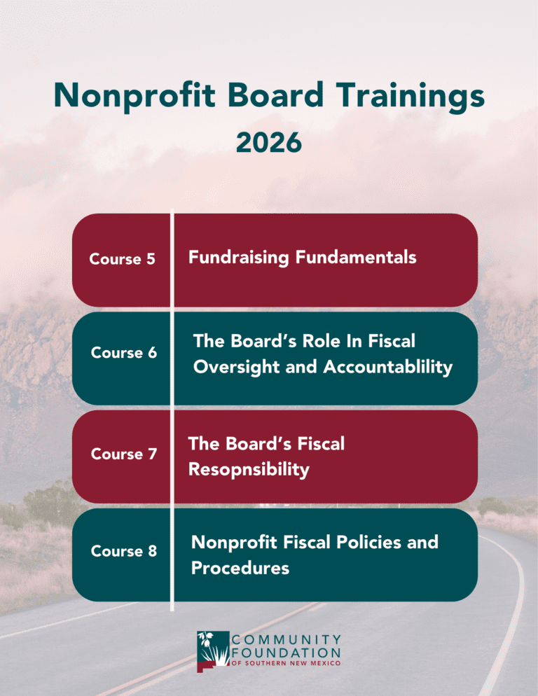The Community Foundation of Southern New Mexico team has become BoardSource Certified Trainers through a partnership with The Paso del Norte Health Foundation and in conjunction with the United Way of El Paso County. This is a wonderful opportunity to ensure the success of nonprofit organizations that serve our communities through workshops, training and summits. The REALIZE Board Training is assuring all nonprofit board of directors are fully prepared to undertake their critical responsibilities.